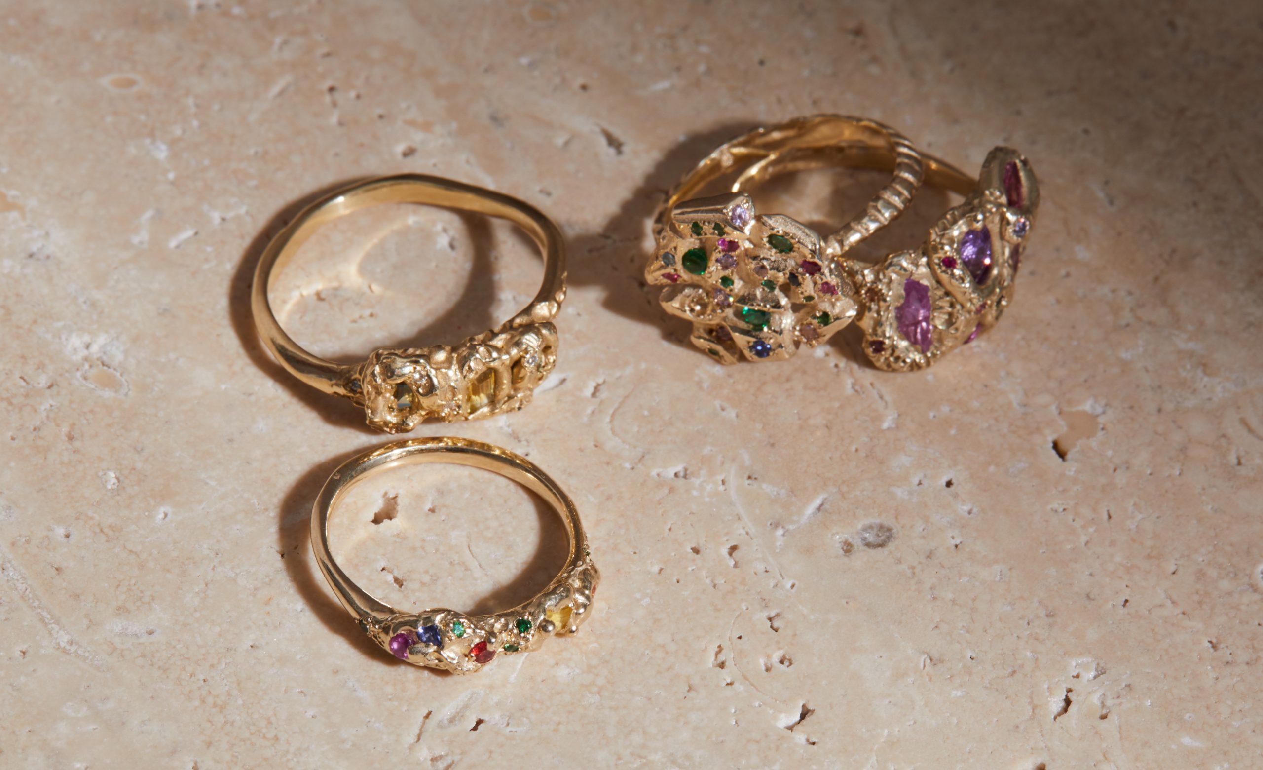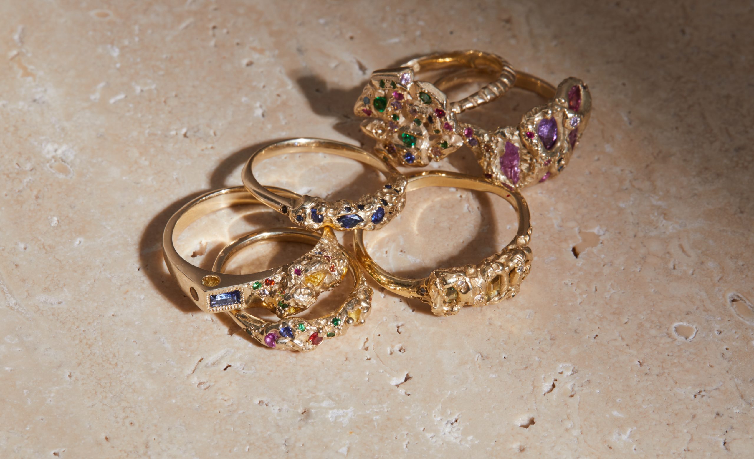 This Textured 9ct Gold Ring is adorned with a vibrant burst of colourful sapphires and tsavorite garnets, creating a striking and dynamic design. The combination of cast-in-place and millgrain settings enhances the texture and depth of the ring, making it a true statement piece.
